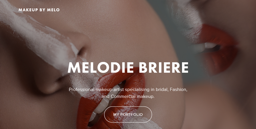 For artists looking to showcase their makeup skills, Makeup by Melo is a great portfolio website to seek inspiration from. The homepage features a full-width hero image of a dramatic makeup look, highlighting the artist’s skill in unique style and techniques.