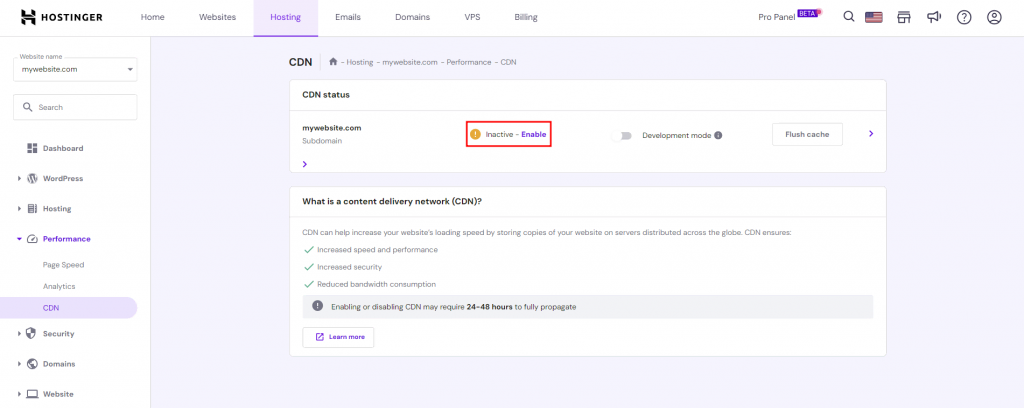 Now out of beta, this in-house solution comes pre-installed with our hosting services to enhance website performance by up to 40%. To activate this feature, you only need to navigate to Performance → CDN from hPanel and click Enable.